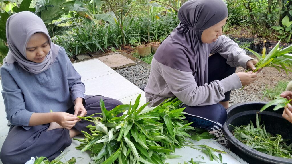 Di sisi lain, panen kangkung dan bayam organik tetap berjalan setiap hari. Hasilnya langsung dijual ke warung setempat. Ini bukan cuma soal hasil panen, tapi juga bagian dari proses belajar bertani yang terus berkembang. Kampung Ilmu terus mencari cara untuk menghasilkan sayuran berkualitas dan dalam jumlah yang memadai.